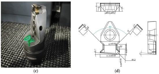 Key components of the experiment include: (a) workpieces utilised in the machining process; (b) configuration of the power quality analyser to assess the output from the spindle drive; (c) assembly of the cutting tool; and (d) geometry of the cutting plate.