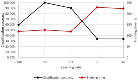 Optimisation of the learning rate against classification accuracy and the training cycle duration.