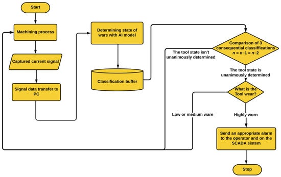 The unanimous voting system is a basic algorithm that compares 3 consecutive classifications that the neural network prediction model performs in real time. When the system recognises an identical wear level after three machining cycles in a row, the process can be interrupted, with the minimum risk of a false alarm downtime. The flowchart for the final monitoring application can be seen in Figure 6.