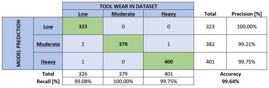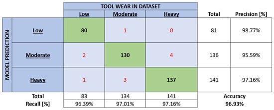 While a classification accuracy of ~97% is certainly high, additional methods were consulted to improve the reliability of the model even further. A method that was implemented is an inherent redundancy that requires the model to make three consecutive identical tool wear estimations (Figure 8), before resulting in an alarm or notification to the process overview interface. A more detailed description can be found in Section 2.6.