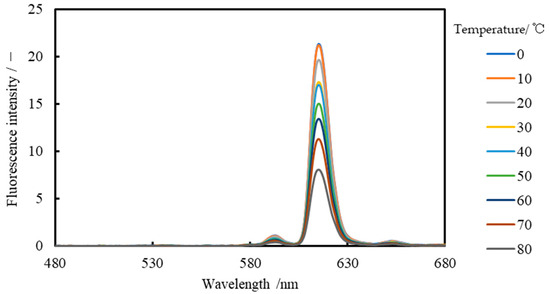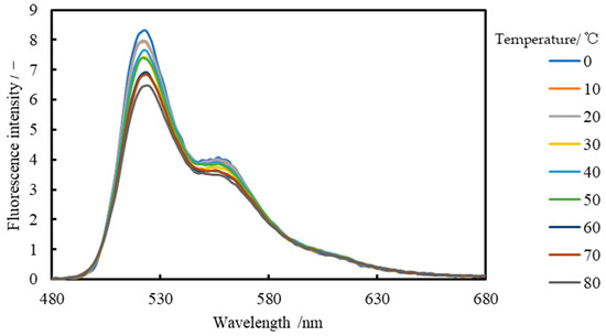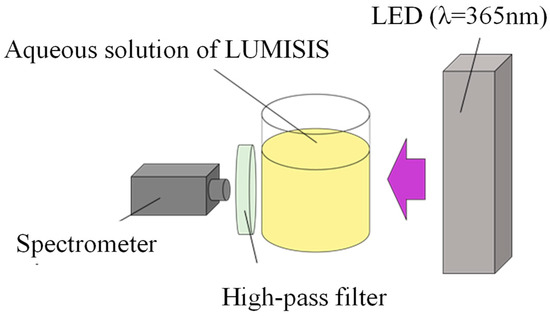 In this study, we measured the temperature dependence and wavelength distribution of each Lumisis phosphor (Red and Green) to investigate the feasibility of the two-color LIF method. The experimental setup for evaluating the measurement dependence of Lumisis phosphor is shown in Figure 2. The wavelength distribution was measured using a spectrometer (Hopoocolor Co., Ltd., Hangzhou, China, HPCS-300, wavelength: 350–780 nm), where phosphors were dispersed in water because the measurement target needed to be sufficiently large. The aqueous solution was stirred to maintain a constant temperature. A UV LED light (λ = 365 nm) was used as the light source. The aqueous solution was heated to 20–80 °C, and the fluorescence wavelength distribution was measured using a spectrometer at 10 °C intervals. Subsequently, the wavelength distribution was measured. A high-pass filter (transmission wavelength > 470 nm) was used to remove UV light.