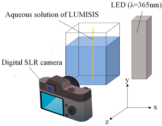 The experimental setup for evaluating the measurement error of the Lumisis phosphor wire is shown in Figure 3. The apparatus consisted of a glass tank in which a phosphor wire was submerged. The light source is a UV LED (CCS LDL-100X50UV2-365-ST, λ = 365 nm, beam irradiance: 23 mW/cm2) irradiated from the front at an angle. The irradiance was sufficiently small such that the effect of heating on the wire surface was negligible. The visualized images were acquired in the z-axis + direction using an ultra-sensitive digital SLR camera (Nikon Corporation, Tokyo, Japan, D7000). The water temperature was raised using a heater and measured at 10 °C intervals from 20 to 50 °C. The water was constantly stirred. By conducting the experiment in water, rather than in air, it was easier to maintain a constant ambient temperature, and the temperature of the entire phosphor wire (in water) could be kept constant. Submerging the wire in water had no effect on the properties of the phosphors because the phosphors were coated with silicone resin. The measurement error was evaluated assuming that the temperature of the entire phosphor wire was constant. A high-pass filter (transmission wavelength > 470 nm) was used to remove UV light. The cut-off frequency of this high-pass filter was lower than the transmission frequency of each RGB image sensor of the color camera; therefore, it was not required. However, it was used to prevent the slight transmission of incident light. This high-pass filter was also used in the experiments described in the subsequent sections.
