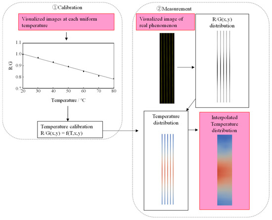 In contrast, various flow visualization methods have been developed for the fluid temperature distribution measurement of liquids. To measure hot water in a water tank, a temperature field measurement method that applies the two-color laser-induced fluorescence (LIF) method [3,4,5,6,7] is known. The authors proposed a method for the simultaneous measurement of temperature and velocity fields using a color camera in combination with two-color LIF and particle image velocimetry by optimizing the type and concentration ratio of fluorescent dyes. The measurement system is relatively inexpensive because the optical system is maintenance-free with only one general-purpose red–green–blue (RGB)-type charge-coupled device (CCD) camera used for imaging, and it has high temperature measurement accuracy. Simultaneous temperature and velocity field measurement methods, in which the tracer particles used in the particle image velocimetry (PIV) tracer are temperature-dependent fluorescent particles [8], phosphorescent particles [9,10,11], or temperature-sensitive liquid crystals [12,13,14,15], have also been proposed. However, there are not many reports on the measurement of temperature-sensitive liquid crystals because of their narrow temperature range and the angle dependency of their fluorescence color [13,14].