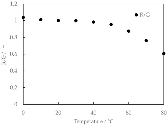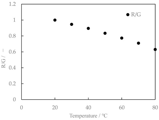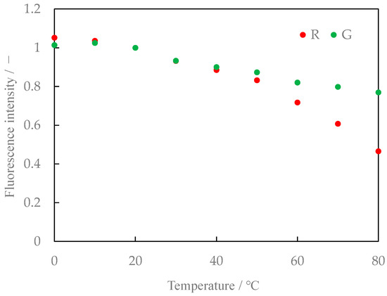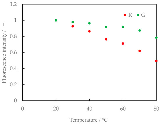 We also studied the mixing ratio of the two types of phosphors and found that the temperature sensitivity varied slightly with the mixing ratio. The fluorescence characteristics for Lumisis phosphor with a mixing ratio of R:G = 1:1.25 are shown in Figure 10. The luminance ratios are shown in Figure 11. The R:G value in Figure 10 and Figure 11 is normalized at 20 °C. Comparing Figure 9 and Figure 11 for the temperature dependence of the luminance ratio, it was found that it shows a monotonous decrease in Figure 9 and Figure 11, while Figure 11 (R:G = 1:1.25) shows a constant temperature dependence over a wide temperature range from 20 °C to 80 °C. Based on these results, a mixing ratio of R:G = 1:1.25 for Lumisis phosphors was selected for this study. However, this choice is not final and definitive. The mechanism through which the temperature sensitivity varies with the mixing ratio is unknown but will be clarified in future studies.