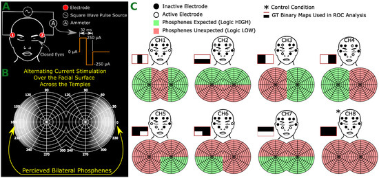 Our study sought to discern how phosphenes can be localized within the VF. More specifically, we explored how NITACS can generate spatially resolved phosphenes within the VF, which was prompted by the desire to develop visual prosthetics via phosphene stimulation [24,25,26,27,28]. Our approach involved placing stimulating electrodes around the left and right eye orbits. This study also aimed to investigate the consistency of electrically induced visual percepts (phosphenes) within an individual and across a population, using controlled superficial cutaneous electrical stimulation parameters supplemented by placebo-controlled trials.