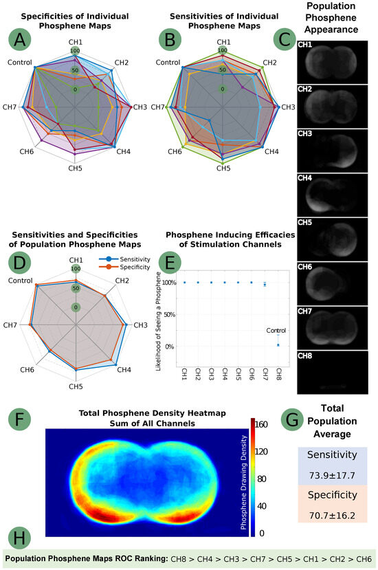 Results data from the NITACS study: (A)—individual map specificities; (B)—individual map sensitivities; (C)—population maps; (D)—sensitives and specificities of population maps; (E)—efficacy figures for stimulation channels; (F)—phosphene density heatmap; (G)—average and deviation for population map sensitivities and specificities; (H)—ROC analysis rankings of the stimulation channels.