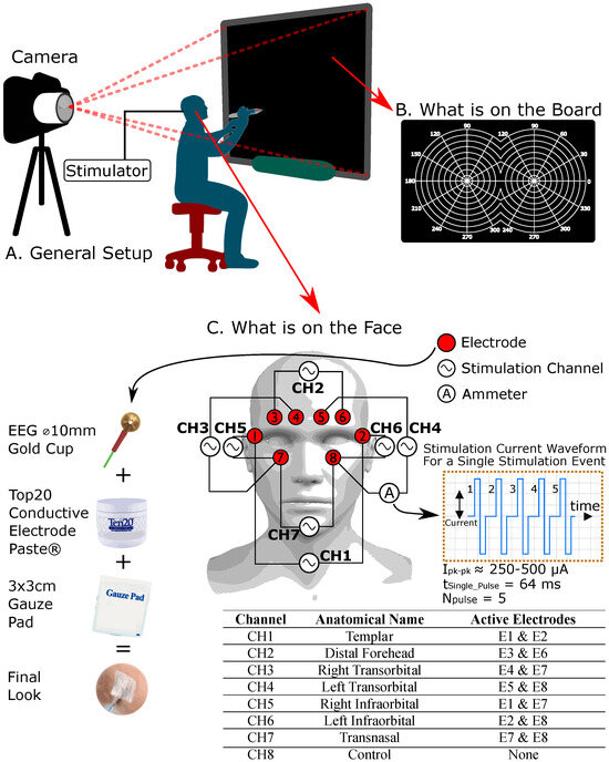 The research protocol was reviewed and approved by the Ryerson University (now Toronto Metropolitan University) REB committee (REB file number: 2019-324). Informed consent was obtained from all subjects before participating. Each participant was led into a dimly lit room and sat on a stool 50 cm away from a smartboard (Figure 4A), which displayed an ophthalmological binocular perimetry target (Figure 4B). This target phenomenologically represents the combined VF of both eyes. As shown in Figure 4A, an off-axis camera was set up to capture the participants’ drawings on the smart board without being obstructed by the participant’s body. Figure 4C illustrates the participant receiving the EEG gold cup electrodes, which were secured with Ten20 electrode paste and further reinforced with a 3 × 3 cm gauze pad. In the initial step, the phosphene stimulation threshold was determined for each participant by gradually increasing the stimulation current intensity until the participant reported seeing a phosphene. The stimulation intensity was kept below 500 µA for safety [1,30], and once phosphenes were detected, the intensity was held constant for the remainder of the experiment. We noted no fading effects requiring increased current, even after extended stimulation periods (15–20 min). After this step, data collection began. Stimulation sites, called stimulation and control channels (CH1, 2, 3, …, 8), were activated in a pseudo-randomized sequence. A MATLAB script created this sequence, ensuring each channel was stimulated eight times, resulting in 64 stimulation events. Only two electrodes were active during each event, and the participant was asked to sketch the perceived phosphene shape on the smartboard (Figure 4A,B). These sketches were collected as phosphene renderings and used for further data analysis. Due to pseudo-randomization, each photograph was traced and linked to its associated channel, making the stimulation sequence appear random to the participant. Upon completion of all stimulation trials, the electrodes were removed, and the participant’s skin was cleaned.