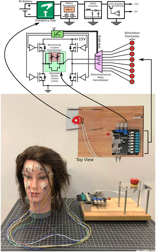 The stimulator, tailored for human studies, aimed to understand how face stimulation locations correlate with phosphenes in the VF. Its electronics and use case, detailed in Figure 5, include a simplified electronics process flow and a lumped electrical model for eight channels. This prototype was battery-powered, using a 9 V battery and designed as a desktop device. It featured an emergency button (as a power button), a boost converter, and linear regulation) to achieve a low noise 15 V voltage rail. The bi-phasic waveform was generated using a dual gate driver (2EDN8524FXTMA1, Infineon Technologies, Germany). This setup and eight double-pole-double-throw electromechanical relays allowed stimulation waveform demultiplexing across multiple electrode pairs. A depletion-mode field effect transistor pair (LND250, Microchip Inc., USA) in a common-drained configuration was used for current limiting during stimulation, utilizing their saturation regions. This was achieved by connecting a double-ganged rheostat in series with the source terminals of the transistors and linking the gate. Placing this circuit in series with the stimulation path allows the continuous adjustment of the current limit (50–500 μA). A microcontroller is used to sequence a series of actions that would lead to the creation of the stimulation waveform. Two other potentiometers are used to collect user input to set the stimulation frequency and pulse width. The device could not measure the threshold current, but was designed to maintain a set maximum current determined by the position of the double-ganged potentiometer.