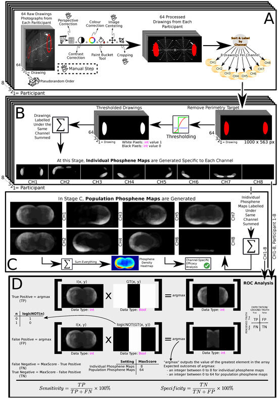 The data processing workflow: (A)—pre-processing drawings into labelled drawings; (B)—generating individual maps; (C)—generating population maps, computing the phosphene density heatmap, and stimulation efficacy analysis; (D)—ROC analysis [31].