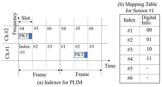 PLIM is an index modulation technique where the index is determined by the transmission timing and frequency channel of the packet. Figure 1a shows the relationship between the channel and time. The frame is divided into short, equally spaced segments called slots, with each slot being shorter than the frame length but longer than the packet length. The frame start time for each sensor is detected using a synchronization signal from the GW. Each sensor sets the waiting time for packet transmission in slots from the frame’s start time, allowing them to select a specific slot for packet transmission by adjusting their transmission waiting time. Moreover, multiple orthogonal frequency channels are prepared, and sensors autonomously select one channel each. Consequently, the total number of indices that can be formed is the product of the total number of frequency channels and the total number of time slots. The digital information is assigned to the index formed in this manner, a process called mapping table. Figure 1b presents an example of a mapping table. Each sensor can independently set its own mapping.