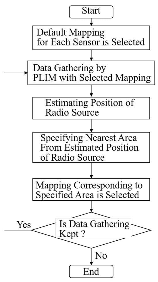 For the information gathered by PLIM, mappings are selected adaptively according to the process flow shown in Figure 3. As we can see this figure, the selecting mapping is composed of the iterative process. Each sensor first informs PLIM of its observed RSSI using the default mapping. Here, a random mapping table is used as the default mapping, constructed by establishing random correspondence between the RSSI numbers and the indices. The RSSI gathered by all sensors is then utilized by the GW to estimate the area where the radio source is located. In the method of estimating the radio source’s location, the sensor observing the maximum RSSI can be considered as the location of the radio source, or the center-of-gravity addition method [28] can be used. The estimated area where the radio source exists is then communicated from the GW to each sensor. Subsequently, the GW and each sensor select a mapping designed according to the RSSI probability distribution for each area. The selected mapping is used to notify PLIM of the RSSI. This series of processes is then repeated: radio source location estimation, area location estimation, GW notifying each sensor of the estimated area, switching the mapping, and PLIM transmission.