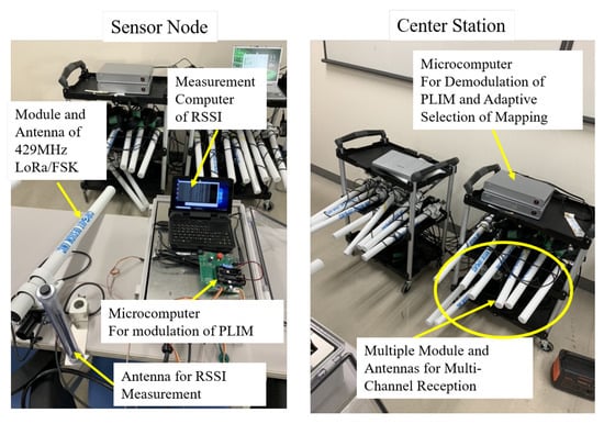 The sensor was equipped with a microcontroller for PLIM control. This microcontroller managed the LoRa-BAR channel and transmission timing to realize the PLIM. Additionally, the sensor featured an antenna for RSSI observation and a universal software radio peripheral for RSSI calculation. Based on the RSSI value obtained, the sensor referred to the mapping table to select an appropriate index. Subsequently, it determined the transmission timing and channel for the packet corresponding to the selected index and transmitted the packet accordingly. A mapping table was designed, with one assigned to each area, where the radio source was present. Consequently, each sensor has a mapping table equal to the number of areas. The GW stored a mapping table recorded for each sensor categorized by area. By employing methods like the maximum RSSI method or the center-of-gravity addition [28], the GW determined the mapping for each sensor corresponding to the identified area. Furthermore, it informed all the sensors within the identified area accordingly. Since each sensor’s LoRa-BAR supported half-duplex communication, the GW received and processed data from each sensor at the time of the announcement. Time synchronization was established during periodic beacon transmissions. Subsequently, each sensor selected a mapping corresponding to the area notified by the GW and used it for PLIM modulation.