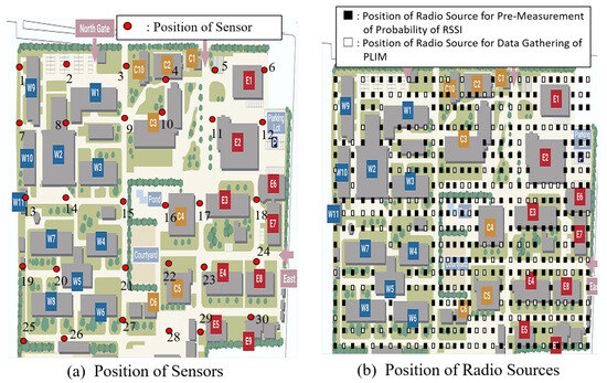 A simulation is conducted assuming a radio sensor that measures the RSSI of radio waves emitted by 920 a band LPWA source. Figure 5 presents an image of the proposed sensor network. Thirty sensors were deployed on the site. Radio sources were placed uniformly and randomly on the site, and the sensors measured the RSSI of the radio waves emitted by the sources. A three-dimensional map of the site was applied to a ray-tracing simulation, and the RSSI at the point where each sensor is placed was determined by the radio sensors. The ray-tracing simulation assumed four reflections, zero refractions, and one diffraction. The measured RSSI was considered to be the RSSI measured by the sensor. Each antenna was assumed omni-directional. The arrangement of the radio sensors and sources is shown in Figure 5. Among the 30 sensors, the number of terminals transmitting in the same frame in PLIM was set from 4 to 8. When x(=4, 5, 6, 7, 8) sensors compete for access in the same frame, the site is divided into x equal parts, and one sensor is randomly selected from each divided area. Of the total radio sources (411 points), 240 points were used as radio emission sources to determine the probability of RSSI generation for each sensor in the proposed method. The remaining 171 points were used to evaluate the packet collision rate when gathering RSSI by PLIM with a generated radio source. Note that two or more radio sources do not emit radio simultaneously; instead, a single radio source emits waves each time. The proposed radio source is divided into nine equal parts, and the positioning method used was center-of-gravity addition. There were a total of 10 values and 10 indexes.