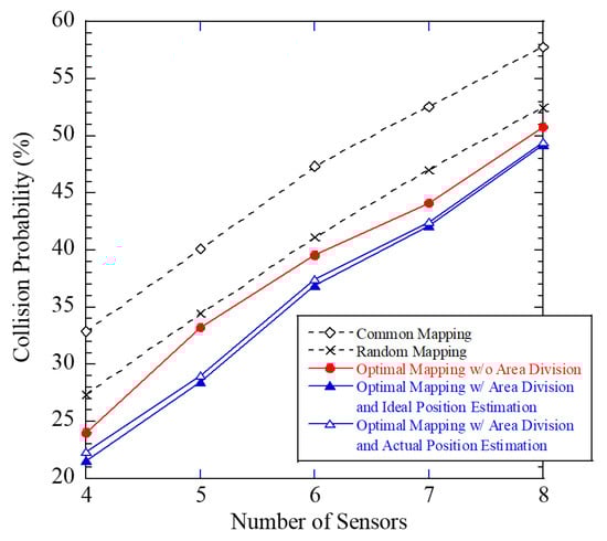 The packet collision probability against the number of sensors is shown in Figure 6. The figure shows four mapping tables: Common mapping, random mapping, optimal mapping without area division, and optimal mapping with area division. In a common mapping table, all sensors use a single common mapping table. In the random mapping table, the correspondence between the information and index is randomly constructed for each sensor. In the optimal mapping table without area division, the construction of the mapping table is based on minimizing the occurrence probability of packet collisions using the pre-measured tendency of RSSI without area division of the radio source. By contrast, the optimal mapping table with area division is based on the area division. In the optimal mapping table with area division, we also show the two results when the area of the radio source is estimated without error and when it is estimated. From the figure, the optimal mapping table with area division and ideal estimation achieves a 15% reduction in the packet collision rate than the common mapping table. Additionally, the optimal mapping table with area division and the actual estimation achieved a 13% reduction. Moreover, the optimal mapping table with area division and actual estimation can achieve about 5% drop from that with area division and ideal estimation. The proposed method effectively suppressed packet collision probability.