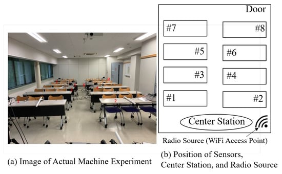 Figure 7 shows the arrangement of the sensors in Experiment 1 and their images. Eight sensor terminals were used in Experiment 1. Each sensor observes the RSSI of the radio waves emitted by the 5 GHz Wi-Fi and notifies the GW via PLIM. The RSSI is quantized at 4 dB intervals from−94 dBm, the minimum value, and quantized into 10 units. In this experiment, both in estimating the prior probability of RSSI occurrence and in aggregating RSSI information using PLIM, the radio sources were assumed to be in the same location. In the trend analysis to determine the probability of RSSI occurrence, the radio source communicated data for 10 consecutive min. Each sensor repeatedly measured the RSSI of radio waves emitted by the source at regular time intervals. The RSSI measured by each sensor was subjected to a histogram analysis to determine the frequency of occurrence of each quantized RSSI, and the probability of occurrence of quantized RSSI was calculated. We repeated this process for each radio source to obtain the occurrence probability of RSSI for each radio source. In other words, we created a database showing the relationship between the occurrence probability of RSSI for each sensor corresponding to a radio wave source. Then, using the occurrence probability of RSSI corresponding to each radio source, we designed a mapping that minimizes the packet collision rate using the proposed method. Through this process, optimal mapping for each sensor was designed based on the location of each radio source. The designed mapping is pre-recorded in the GW and each sensor and used in PLIM.