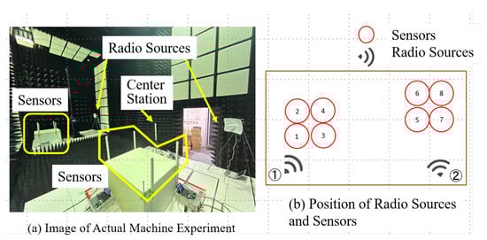 Experiment 2 was conducted in an electromagnetic anechoic chamber with a sensor network and Wi-Fi as the radio source. Figure 8 shows the actual locations of the radio sources and sensors. The radio sources were placed at two locations, each with a radio source device. However, these two radio sources did not emit radio waves simultaneously. In other words, when one radio wave was emitted, the other ceased emitting radio waves. Thus, there was no physical movement of the radio sources and no misalignment between them. Following the same procedure as in Experiment 1, a preliminary trend analysis of radio wave emissions were performed at the placement location of one radio wave source, and measured the RSSI. This process was then repeated at the location of another radio source. A histogram of the quantized RSSI of each radio sensor was then analyzed to obtain the occurrence probability of the quantized RSSI. Using the occurrence probability, an optimal mapping was derived under the packet collision probability minimization condition. Therefore, a mapping table was obtained for each sensor corresponding to the locations of the two radio sources. This resulting table was then stored at the GW and each sensor. In the proposed method, one of the two designed mapping tables was selected and used for information gathered by the PLIM, based on the location estimation of radio sources. Two methods were used to estimate the position of the radio source: one used the position information of the sensor with the largest RSSI as the position of the radio source, and the other estimated the position by adding the centers of gravity [28].
