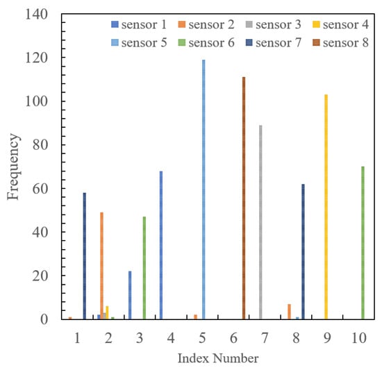 Frequency numbers of indexes selected by each sensor in optimal mapping.