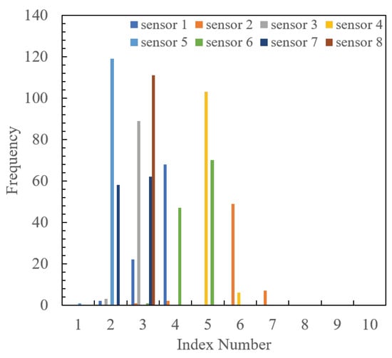 From the table, it is evident that the optimal mapping achieves a higher PDR than the fixed and random mappings by more than . To clarify the reason behind this, the frequency distribution of index selection made by each sensor is shown in Figure 9 and Figure 10. The former represents the case with the proposed optimal mapping, while the latter depicts the common mapping. From the figures, it is evident that in the fixed mapping, multiple sensors frequently select the same index, resulting in frequent packet collisions. However, the proposed mapping shows that each sensor uses a different index, thereby avoiding packet collisions. Since this experiment was conducted indoors with a single radio source and fixed placement, the RSSI value observed by each sensor remains within a certain range. Therefore, sensors located at the same distance from the source tend to have the same RSSI, leading to frequent packet collisions when selecting the same index in the fixed mapping. Conversely, random mapping is more effective than fixed mapping in avoiding collisions, but it is inferior to the proposed method. Therefore, we confirmed the collision-suppression effect of the proposed method by designing mappings based on minimum collision probability conditions.