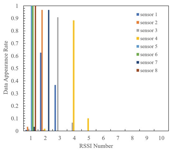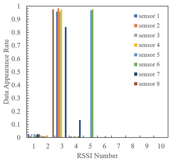 Figure 11 and Figure 12 show the quantized RSSI generation rates for each sensor when the radio source is positioned at 1 and 2, respectively. It is evident that at both radio source positions, each sensor generates a high percentage of specific RSSI values, with a narrow and limited spread of quantized RSSI. Consequently, the optimal design using the proposed method ensures that each sensor transmits high-frequency RSSI at different indices, effectively mitigating packet collisions. Furthermore, the RSSI distribution at position 1 is more widely spread than that at position 2, with a higher proportion of RSSI failing within multiple quantization intervals. This disparity arises because when quantizing RSSI, the RSSI value measured at position 1 corresponds to the boundary of the quantization interval. This may lead to slight fluctuations triggering RSSI quantization switches, thereby obtaining a variety of RSSIs compared to position 2.