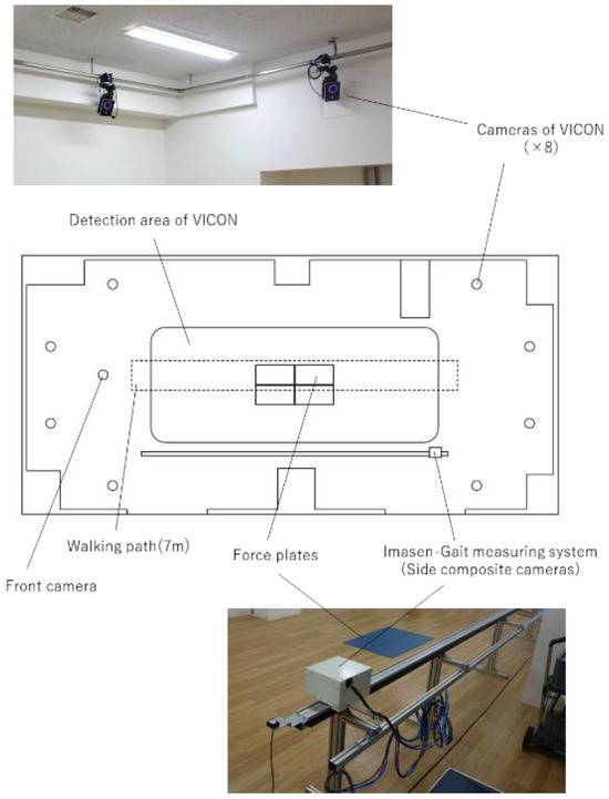 Imasen and OpenPose measurement environment. (a) Camera structure. (b) Location of walking paths and cameras.