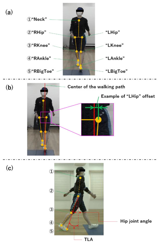 OpenPose nodes. (a) Nodes at each site on the skeletal estimate. (b) Center of walking path and offset. We converted each coordinate of the front camera created to coordinates in real space, calculated the value of offset from the center of the walking path with respect to those coordinates in real space, and calculated the average of those offset values. (c) How to calculate the TLA. TLA, trailing limb angle.