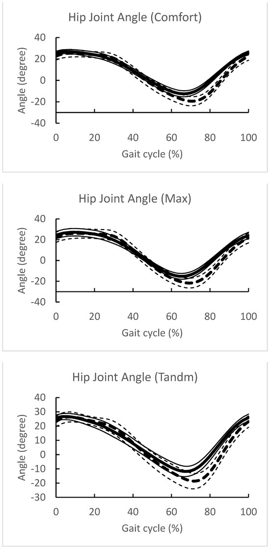 Hip joint angle change in one gait cycle. The changes in joint angles for each of the three gait patterns are summarized. The identification of one gait cycle was normalized, so that 0 was the time when the central axis of the hip joint crossed over the central axis of the ankle joint, and 100% of one gait cycle was identified. The solid line indicates the mean value for all subjects in the Imasen gait system, and the dashed line indicates the mean value for all subjects in the VICON system. The SD of the SD is also described.