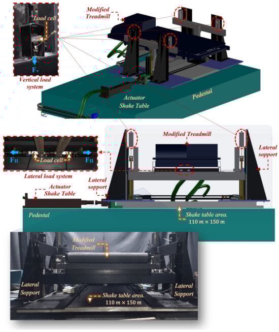 An experimental test framework called the Human–Structure Interaction Multiaxial Test Framework (HSI-MTF), positioned in the Laboratory of Seismic Engineering and Structural Dynamics (LINSE) at the Universidad del Valle, Cali, Colombia, was developed to evaluate the kinetic effects on human gait produced by surfaces with lateral harmonic motion. This framework allowed the generation of three main conditions: (i) the repetitiveness of human gait for the evaluation of its stochastic and random nature; (ii) the incidence of net lateral motion on test subjects; and (iii) the acquisition of the generated anthropic loads. One or two of these characteristics are present in the setups performed by Nakamura et al. [], Ingólfsson et al. [], Pizzimenti et al. [], Carroll et al. [], Bocian et al. [], and more recently, Haowen et al. []. However, none of these studies performed a biaxial configuration for the lateral and vertical evaluation of the loads induced by the human gait under the effects of a surface with lateral motion, which is the condition addressed in this research. The HSI-MTF, schematically shown in Figure 2, consists of four main components, as listed in Table 2.