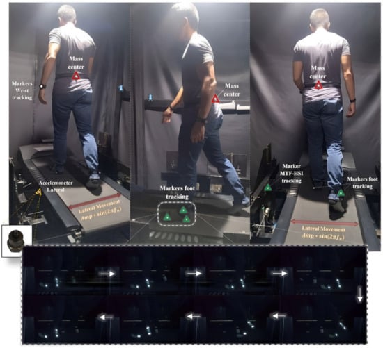 Experimental tests were conducted on the HSI-MTF for the STs, as shown in Figure 3. These tests involved acquiring the lateral and vertical forces induced by human gait on rigid and flexible surfaces with a sample time of 500 Hz. The human gait was performed at a constant velocity of 1.10 under lateral sinusoidal movements induced for the HSI-MTF of 5.0, 10.0, 20.0, 30.0, and 50.0 mm, with frequencies for each displacement ranging from 0.70 to 1.30 Hz in steps of 0.10 Hz, and a duration of 30.0 s for each frequency step. In addition, a low-cost MOCAP system was implemented using smartphone devices (Xiaomi Redmi 9T (Xiaomi, Beijing, China) with 48.0 Mpx and a sampling rate of 30.0 fps) and four passive retroreflective adhesive markers with a diameter of 12.0 mm that were attached at specific points of interest: the center of mass, ankle, heel, and metatarsus (Figure 3, middle). This technology was implemented with the aim of identifying the gait cycle times and displacements in relation to the behavior of lateral loads. Before the tests, each ST carried out 2.0 min gait pre-testing at their typical gait velocity (approx. 0.90 ). Seven static tests and 245 dynamic tests were performed.