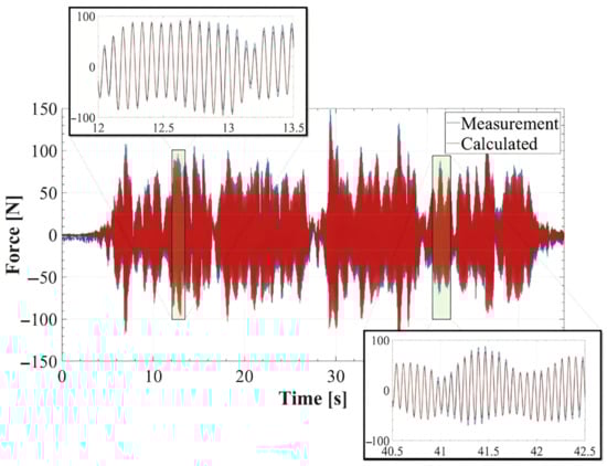 where denotes the measured load from the ith load cell and and are the mass and measured acceleration of the HSI-MTF, respectively. First, two sine waves of 7.50 mm at 1.0 Hz and 2.50 mm at 1.30 Hz were used as inputs in the system, and the lateral load and acceleration of the HIS-MTF were recorded without the action of any human gait. In this case, should be zero. The measured inertial force, which is the first right portion of Equation (1), coincided with the one calculated with , as shown in Figure 4 for the first proposed sine-wave signal, which indicates a zero for , according to Equation (1). The goodness of fit (FIT, Equation (2)) and Pearson linear correlation coefficient (ρ, Equation (3)) were calculated to assess the accuracy of the HIS-MTF in acquiring the induced force in human gait and inertial force.