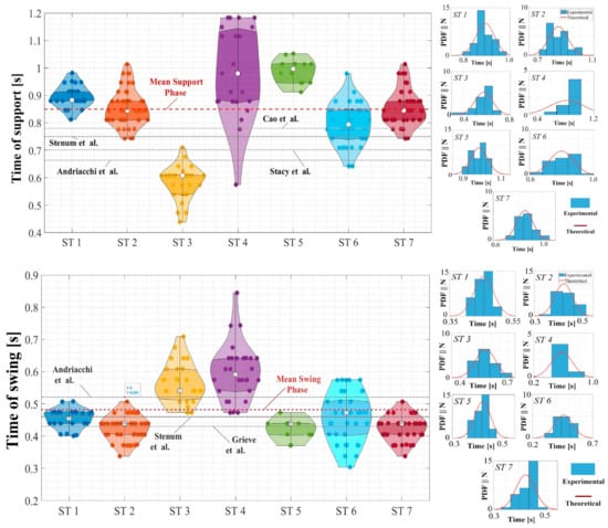 Statistical analysis of human gait support and swing periods; violin plot of the support phase duration and its probability density function for each subject test (top); and violin plot of the swing phase duration and its probability density function for each subject test (bottom); []—Grieve et al.; []—Andriacchi et al.; []—Stenum et al.; []—Stacy et al.; []—Cao et al.