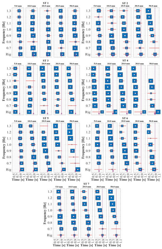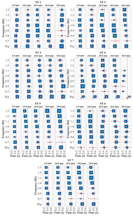 Despite the low percentage differences compared with other investigations, as shown in Figure 5 (top: support time; bottom: swing time), the results of human gait on a rigid surface suggest significant intra- and inter-personal spatiotemporal variability (ST 3, 4, and 6; shown in Figure 5) between the participants, emphasizing the need for additional experimental assessment. This condition of relative variability within everyone becomes even more critical when comparing walking on a rigid surface with walking on surfaces with harmonic lateral movements because of noticeable changes in the support and swing phases generated by the coupling of the walking of the STs with the harmonic dynamics of the excitations induced by the HSI-MTF. Figure 6 and Figure 7 present the variations in the periods and , respectively, for displacements (5.0 to 50.0 mm) and lateral frequencies (0.7 to 1.3 Hz) induced in the gait of all evaluated STs, according to the proposal in Section 2.4. In these figures, a forest plot diagram is used, where white dots represent the mean values obtained for the indicated displacements and frequencies. In addition, the size of the blue boxes varied inversely proportional to the standard deviation of the respective test, and the horizontal red lines indicate the first calculated standard deviation. Although in the case of ST 1 the variations for the period are minimal compared to the average of all STs on a rigid surface, significant changes occur in the period for displacements of 20.0 and 30.0 mm, indicating a brief implication of the coupling effects that alter gait dynamics. This is further supported by the remaining STs, which show decreases of up to 96.53% and 58.15% for the periods and , respectively, for some induced displacements and excitation frequencies compared with the overall average obtained on a rigid surface for each ST. These results align with those of studies on laterally instrumented treadmills reported by Nakamura et al. [], Sun and Yuan [], Pizzimenti et al. [], Ingólfsson et al. [], Ricciardelli et al. [], Bocian et al. [], and Haowen et al. []. Furthermore, they are consistent with investigations on some pedestrian bridges in a similar analytical context, such as those conducted by Butz et al. [] and Rönnquist []. In both cases, an alteration in the of the STs was reported as the frequency and magnitude of the induced lateral displacement increase or an increase in anthropic loads. These reports indicate an alteration of the natural gait kinematics and, consequently, of , consistent with the behavior presented in this assessment of the human gait in this study.