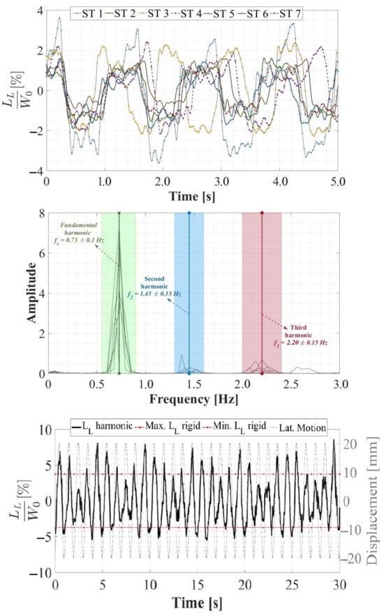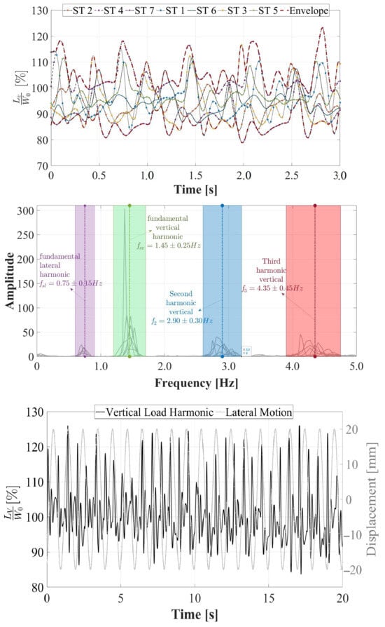 The total vertical load (LV) induced by the gait of the STs on a rigid surface under the influence of lateral vibrations was acquired and assessed in this study. The acquisition was conducted using the HSI-MTF, which constitutes a novel comprehensive development for the multiaxial acquisition of anthropic loads that has not been previously documented in the literature. As outlined in Section 2.5, a 30.0 s evaluation of the LV induced by gait on a rigid surface was performed for the seven STs. The LV load was normalized with respect to the weight W0 of each ST, resulting in an average normalized vertical load of 110.0% and a maximum of 123.0%. These values are presented in Figure 10 (top) for all STs within a 3.0 s range. Furthermore, these LV loads were processed using cross-power spectral density in accordance with Equation (5), as elaborated in Section 3.2.1. Then, the average fundamental vertical gait period was identified as fsv = 1.45 ± 0.25 Hz, the average second vertical harmonic as fv2 = 2.90 ± 0.30 Hz, and the average third vertical harmonic as fv3 = 4.35 ± 0.45 Hz for all STs, as illustrated in Figure 10 (middle). Additionally, a noticeably lower fundamental lateral gait frequency was discernible when compared to those presented in the vertical direction. This observation arises from the analysis of the total vertical force. Moreover, in Figure 10 (bottom), the normalized LV load induced by ST 1 on the lateral harmonic surface is considered, featuring a frequency of 1.0 Hz and an amplitude of 20.0 mm. The objective was to demonstrate the typical behavior of a sinusoidal LV series and its anisotropic behavior, both in phase, with respect to lateral vibrations, and in magnitude.
