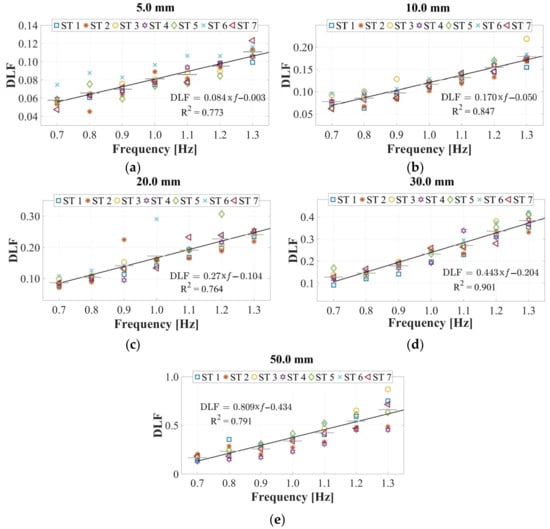 Considering the aforementioned aspects, the present study emerges as a contribution for experimental campaigns of simultaneous lateral and vertical gait loads acquisition (utilizing the HSI-MTF) and assessment of lateral and vertical human-induced DLFs. The focal point of this investigation is the variation of these factors due to their interdependence with the lateral displacement amplitudes and frequencies. As evidenced by the outcomes depicted in Figure 9, these results show a linear growth in DLF values proportional to the escalation in the lateral excitation frequency. Additionally, an augmentation of this proportionality constant was identified in relation to the increase in the amplitude of the lateral vibrations. Moreover, parametric expressions capturing the interdependence between the lateral excitation frequencies and DLFs were established for each lateral amplitude value, yielding an average R2 value of 0.815 for linear regressions of the form . In addition, lateral excitation amplitudes equal to or exceeding 50.0 mm induce alterations in pedestrian gait kinematics as individuals strive to maintain the center of mass stability during vibrations. This adjustment substantially heightens the laterally induced force from pedestrians (an 82.6% increase compared to lateral excitations with 40.0 mm amplitudes).