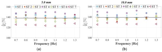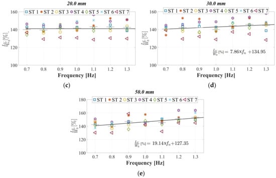 The utilization of instrumented treadmills marked a significant advancement for the continuous measurement of forces induced by human gait over time, unencumbered by restrictions on stride length owing to test area dimensions. Sun and Yuan [] integrated a treadmill, a force plate, and a shake table, and seven STs were assessed using this framework at two walking speeds (0.83 and 1.00 ), subjected to combinations of lateral vibrations with frequencies of 0.65–1.2 Hz and amplitudes of 4.0–50.0 mm. The expression was introduced in this study; however, this formulation solely depends on the lateral displacement , disregarding the significant effects of frequency changes, even for the same displacement value. This phenomenon, as demonstrated in this study and depicted in Figure 9, was observed.
