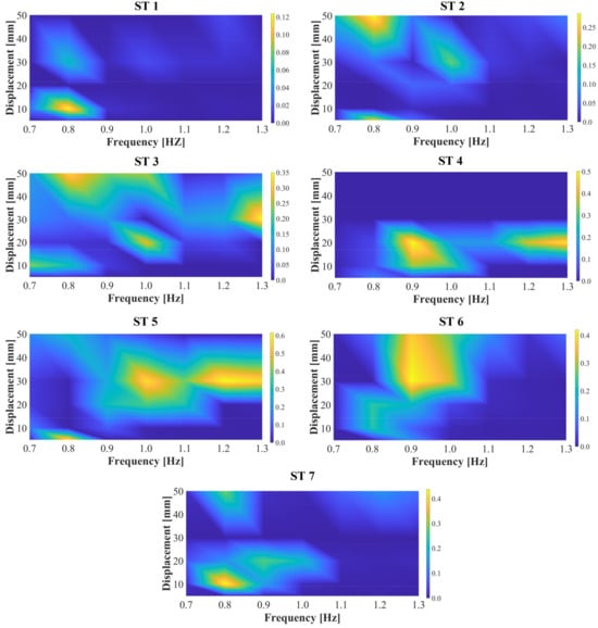 In this context, the present research determined existing correlation levels between the induced lateral vibrations (HSI-MTF reference control point) and the estimated center of mass (CM) displacements for each ST. The tracking points are shown in Figure 3 (top, right). The marker-based motion capture system used and implemented is rated in Section 2.4 and Section 2.5. The correlation values were calculated for the seven STs based on Equation (3), considering different combinations of HSI-MTF lateral vibration frequencies and amplitudes, as illustrated in Figure 12. Within these correlation surfaces, a distinct and specific behavior is established for each ST, which is an important detail to note given that even under the same lateral vibration conditions, STs experience varying S2HI effects. Maximum correlation levels of were obtained for ST 1 during lateral vibrations with an amplitude of 10.0 mm and a frequency of 0.8 Hz. By contrast, ST 5 exhibited a maximum correlation of for vibrations with amplitudes of 30.0 mm and frequencies exceeding 1.0 Hz. These experimental findings establish a foundation for understanding the kinematics of each pedestrian under the effects of S2HI.
