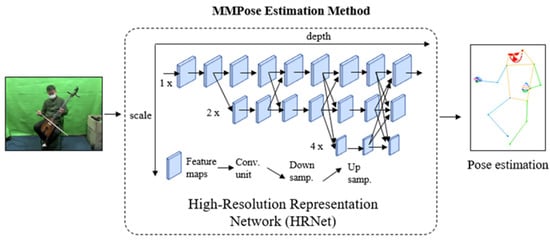 The HRNet utilizes the concept of multi-resolution representations, where high-resolution representations are extracted and fused to generate more robust features. HRNet has a unique architecture that enables it to process high-resolution images efficiently, by avoiding down-sampling or up-sampling operations that may cause information loss or computation overhead. It has multiple stages that gradually refines features, allowing it to learn increasingly complex representations. The HRNet architecture starts from high-resolution sub-network, followed by the addition of low- resolution sub-network as the network goes deeper to create multi- resolution. The multi- resolution information is fused by exchanging information repeatedly across parallel multi-resolution sub-networks. Finally, the HRNet estimates keypoints based on the high-resolution representations that are outputted. Figure 2 displays the HRNet network in the MMPose estimation method, where the x-axis indicates the network depth and the y-axis represents the feature map scale.