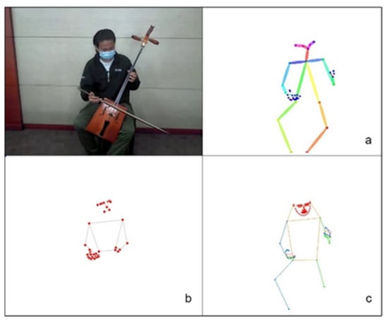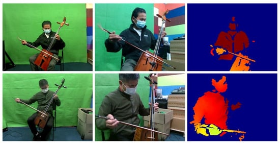We collected data from both professional and novice musicians’ performances using two cameras: a Logitech C200 webcam (Logitech, Lausanne, Switzerland) for recording RGB footage (color video) and an Intel® RealSense™ camera SR300 (Intel Corporation, Santa Clara, CA, United States) for capturing RGB-depth data, providing combined color and depth information. This resulted in a dataset containing RGB front-view and side-view videos of the performances, along with corresponding MIDI files (musical note information) and depth sequence data. To extract meaningful information from the videos, we applied preprocessing techniques using a segmentation module. This involved identifying key points on the musician’s body (landmarks) and segmenting the four individual parts of the Morin khuur (body, bow, upper bridge, and lower bridge) for further analysis.