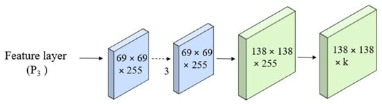 Protonet is a network that predicts a set of prototype masks for the entire image. It learn during training to represent the different object categories that the model can detect and segment objects in real-time. We employ the Feature Pyramid Network (FPN) within the Protonet network. Importantly, the deeper backbone features produce better performance on smaller objects. In our model, the largest feature layers, denoted as P3, are the deepest. The increase in size is accomplished through an upsampling operation, followed by a convolutional layer, and further enhanced by the ReLU activation function. The architecture of the Protonet network is depicted in Figure 6. The labels provide information about feature dimensions and channels corresponding to the image size. The arrows represent 3 × 3 convolutional layers, with the exception of the final convolutional layer, which is 1 × 1 in size and is denoted as k to represent prototypes.