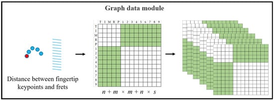 The MMPose estimation method generates pose estimation data, from which we extract fingertip keypoints. These keypoints, along with fret positions obtained from instrument parts using the YOLOACT segmentation method, are then used as inputs for the Graph Data module. This module calculates the distances between fingertip keypoints and fret positions, as illustrated in Figure 7. The resulting joint-stream and motion-stream graph data is subsequently fed into the STA-GCN module for further processing.