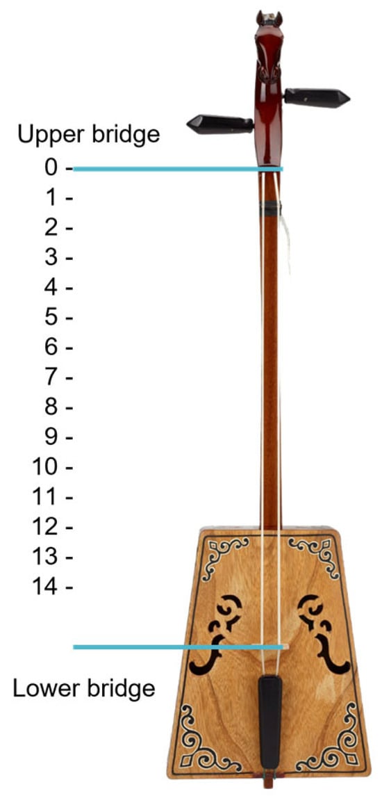 The morin khuur, a traditional Mongolian bowed string instrument, does not have frets on its bridge. Unlike many other string instruments, such as guitars and lutes, the Morin khuur has a smooth, unfretted neck. To determine fret positions, the space between frets decline in a consistent ratio, as depicted in Figure 8. Table 2 illustrates the standard scale length for each fret based on the size of the instrument, which includes small, medium, and large sizes [].