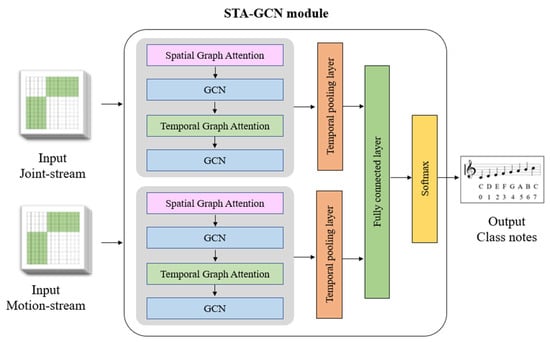 Initially, the joint-stream and motion-stream graph data are input into the Spatial-Temporal Attention and Graph Convolutional Network (STA-GCN) module, as illustrated in Figure 9. Within this module, the spatial graph attention mechanism captures the spatial dependencies among the key points in the joint-stream and motion-stream data, allowing the model to learn how the relative positions of hand joints and the locations of instrument sections influence each other. Subsequently, the Graph Convolutional Network (GCN) refines the learned features for each data stream through graph-based convolutions. Imagine the hand and instrument segmentation data as graphs, with keypoints/instrument sections as nodes and connections between them as edges. The GCN leverages these connections to further refine the understanding of how these elements relate to each other within each stream.