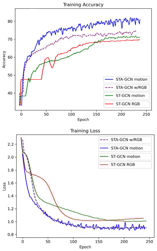We evaluated the performance of our proposed method (STA-GCN) by comparing it with various data types, as illustrated in Table 3. These include two-camera data, data without side camera input, data without front camera input, motion data, motion data combined with RGB, and RGB data alone, as well as ST-GCN with motion data and ST-GCN with RGB as baseline models. The results indicate that our proposed method utilizing motion data achieved the highest accuracy of 0.81, with a loss value of 0.93. Conversely, the lowest accuracy of 0.43, with a loss of 2.76, was obtained when using two-camera data. The training accuracy and loss are illustrated in Figure 12.