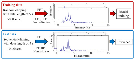 The BCG signals of seven individuals (age range approximately 20–65 years) were analyzed. The BCG signals were obtained for 200 s or more for each participant sitting on the chair equipped with a piezoelectric sensor. For the entirety of the measurement range, evaluations were conducted utilizing signals generated when the subjects were seated, and the time domain excluding periods affected by saturation was employed for analysis. Within this framework, precise time intervals (in approximately 10 s increments) were delineated. The training dataset for each individual was augmented using these signals. Because the stability of the data obtained differed depending on the participant, we determined and verified the stability range for each individual. Therefore, the measurement time used for the training data and the temporal timing of test data differed slightly. The workflow of the training data augmentation and inference datasets is illustrated in Figure 3. First, a measurement region with stable data was selected based on the on/off signals of the sensor. Second, multiple spectra were generated by clipping the spectra, with a data length of 5 s, from a randomly selected starting point. Third, the generated spectra were fast Fourier transformed (FFT), wherein a high-pass filter was employed to substitute components within the frequency range of 0 to 0.1 Hz with an intensity value of 0. Furthermore, a low-pass filter was subsequently applied to eliminate high-frequency components exceeding 15 Hz. Finally, each spectrum was normalized such that the maximum value was 1.