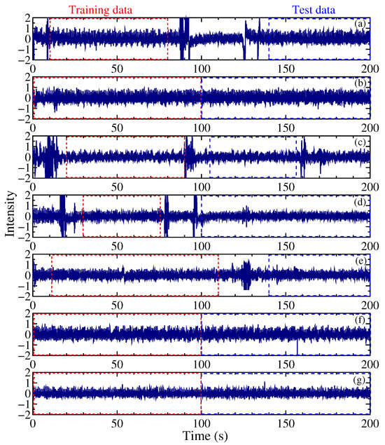 Ballistocardial signals for (a) P1, (b) P2, (c) P3, (d) P4, (e) P5, (f) P6, and (g) P7. The ranges of training data and test data are shown with a red dotted line and blue short dashes, respectively. The vertical axis is normalized to ±1 in the usage area.