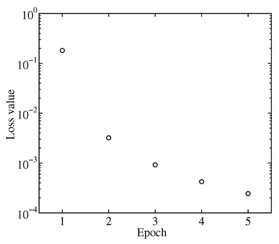 The training time for 5000 datasets was approximately 10 s. The typical loss value decreased from 0.2 to 0.0002 after five epochs (Figure 6). The inference processing time for each dataset was 20 ms.