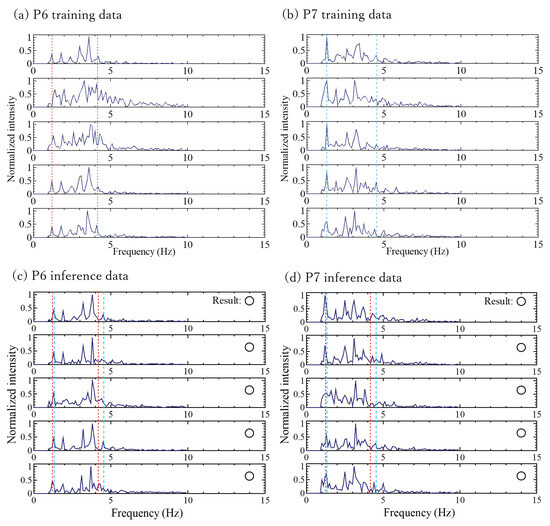 Subsets of the training data of (a) P6 and (b) P7. Subsets of the inference data and classification results of (c) P6 and (d) P7. The red dotted line represents the main peak position of P6, and the blue dashed line represents the main peak position of P7. Inference data are shown with frequency on the horizontal axis and normalized intensity on the vertical axis.