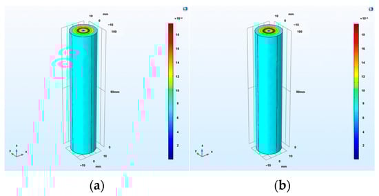 In this paper, for different magnetic flux collectors, a cylinder with the same radius is selected as the magnetic core (r = 2 cm), and magnetic flux collectors are added at both ends of the magnetic core. In order to explore the effect of adding magnetic flux collectors, two disc-shaped magnetic flux collectors (radius: r = 4 cm, thickness: h = 1.4 cm) were added to both ends of the magnetic core. The material used was the same lossless soft iron material as the magnetic core. This paper compared the relative effective magnetic permeability simulation results obtained after adding flux collectors with the simulation results without adding magnetic flux collectors. The radius of the two magnetic cores without adding flux collectors is 2 cm, and the length is 15 cm and 25 cm, respectively. The curves are shown in Figure 8a. It can be seen from Figure 8a that, after adding the flux collector, the relative effective magnetic permeability of a 15 cm long magnetic core in a linear region 5 cm away from the geometric center along the axial direction increases by an average of 15.38. These data are 107% higher than the situation without adding a magnetic flux collector, achieving a similar effect when the core length is increased to 25 cm. If the core length is increased to 25 cm, 66.67% additional material needs to be added. At this time, if a magnetic flux collector is added, an additional 74.66% of material needs to be added. Obviously, the effect of adding a flux collector at this time is not as good as increasing the core length.