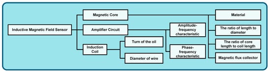 The design of the magnetic field sensor in this paper is divided into three parts: magnetic core, induction coil, and amplifier circuit, as shown in Figure 2.