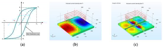 Simulation diagram of eddy−current generation: (a) Hysteresis loop of ferromagnetic materials. (b) Induced current density in conductor during 50 Hz. (c) Induced current density in conductor after block during 50 Hz.