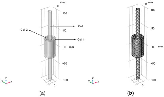 The geometric model and the meshing diagram of the magnetic core and coil: (a) the geometric model of the magnetic core and coil; (b) the meshing diagram of the model.
